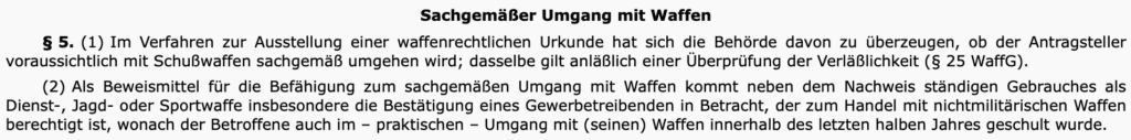 Aus diesem Paragrafen ist herauszulesen, dass es auch andere Wege gibt, Ihrer Waffenbehörde den sachgemäßen Umgang mit Waffen nachzuweisen. So etwa explizit der Nachweis des ständigen Gebrauchs der Waffen als Dienst-, Jagd- oder Sportwaffe. Das Vorhandensein von Sammlerwaffen hingegen reicht nicht automatisch als Alternative zum Waffenführerschein. Wenn Sie also bereits seit einer Weile (mind. 12 Monate) schießen gehen und dies nachweisen können, müssen Sie nicht zwingend einen Waffenführerschein absolvieren; aber Sie müssen die regelmäßigen Schießtermine nachweisen.
